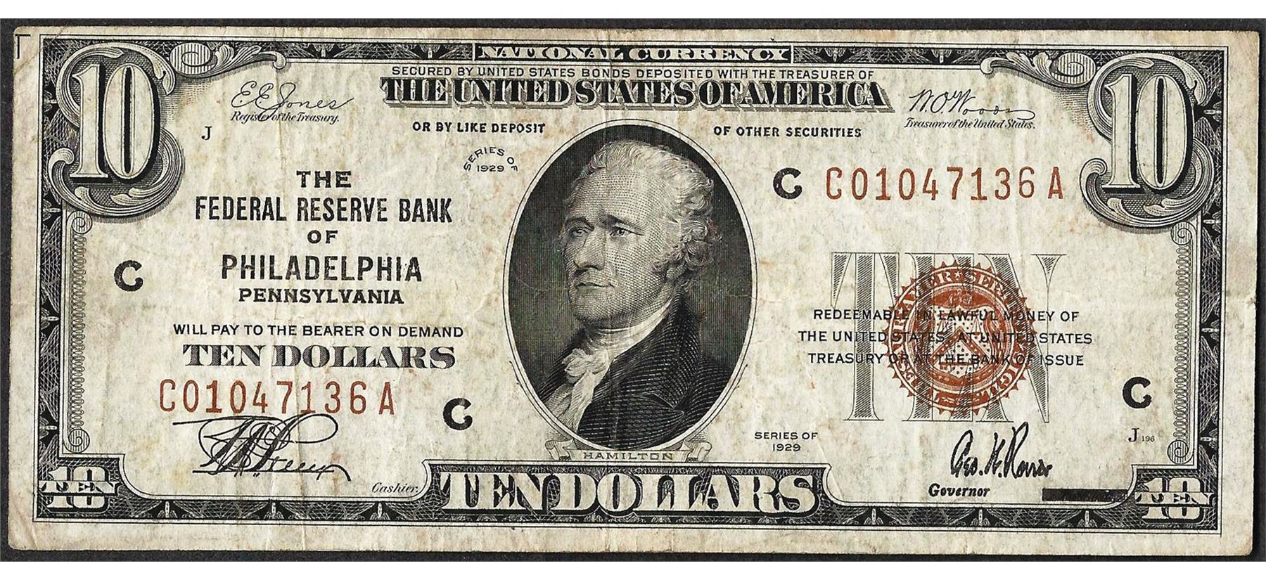 One 1929 $10 Federal Reserve Bank of Philadelphia Note.