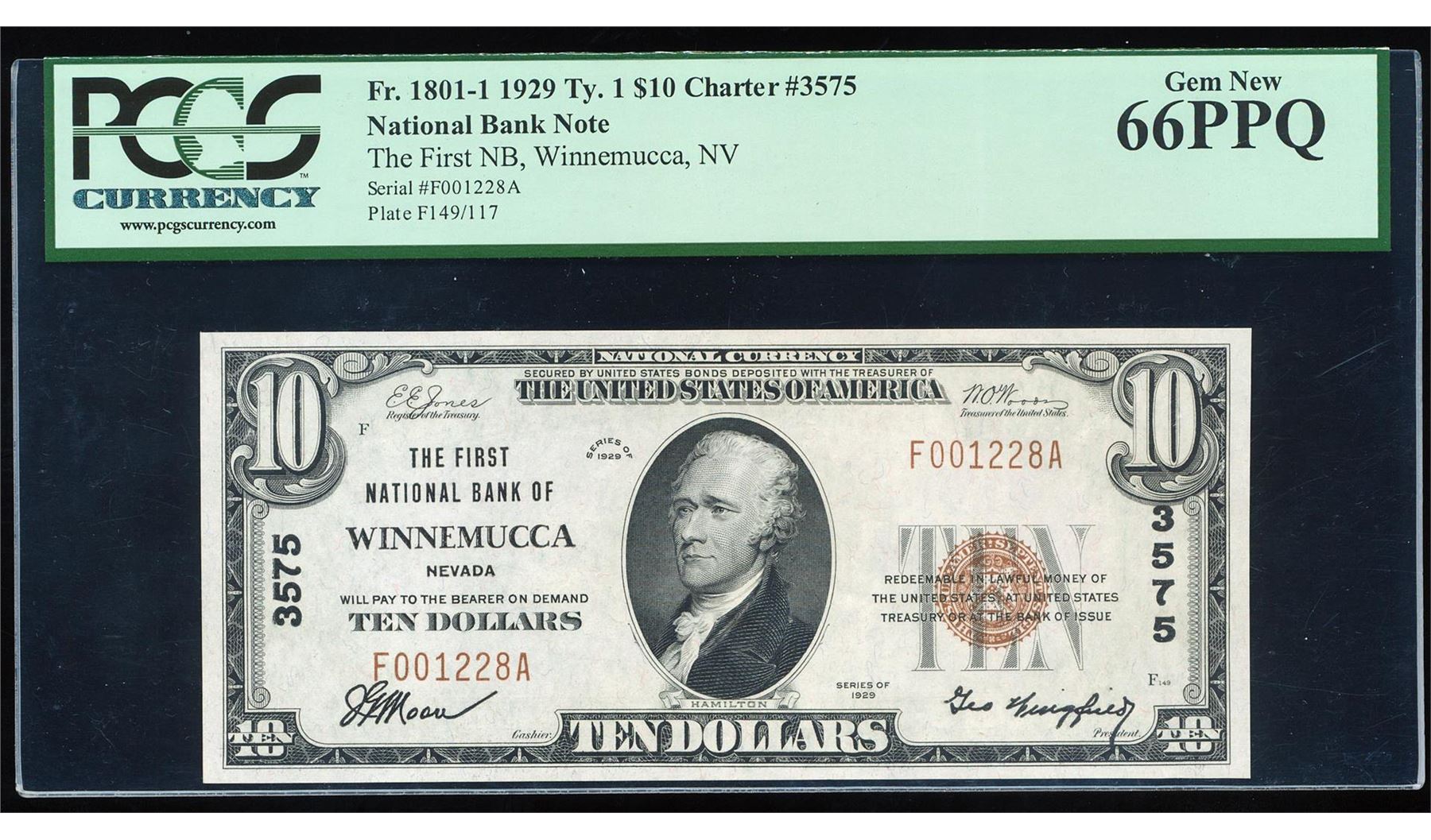 One 1929 $10 First NB Winnemucca, NV CH# 3575 National Currency Note PCGS Gem New 66PPQ.