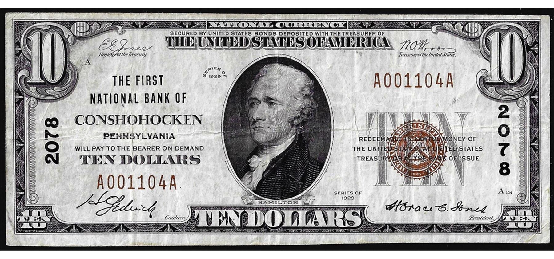 One 1929 $10 First NB of Conshohocken, PA CH# 2078 National Currency Note.