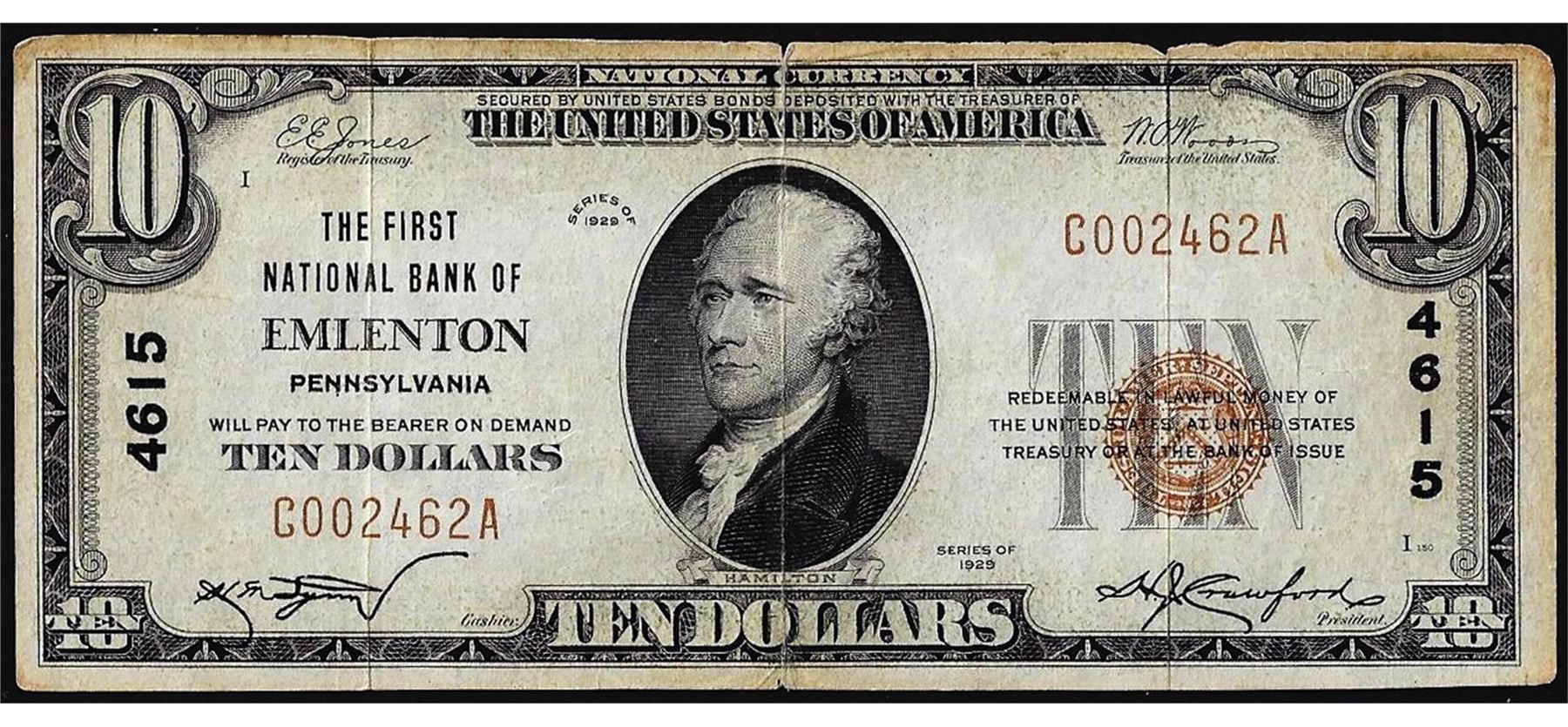 One 1929 $10 First NB of Emilenton, PA CH# 4615 National Currency Note.