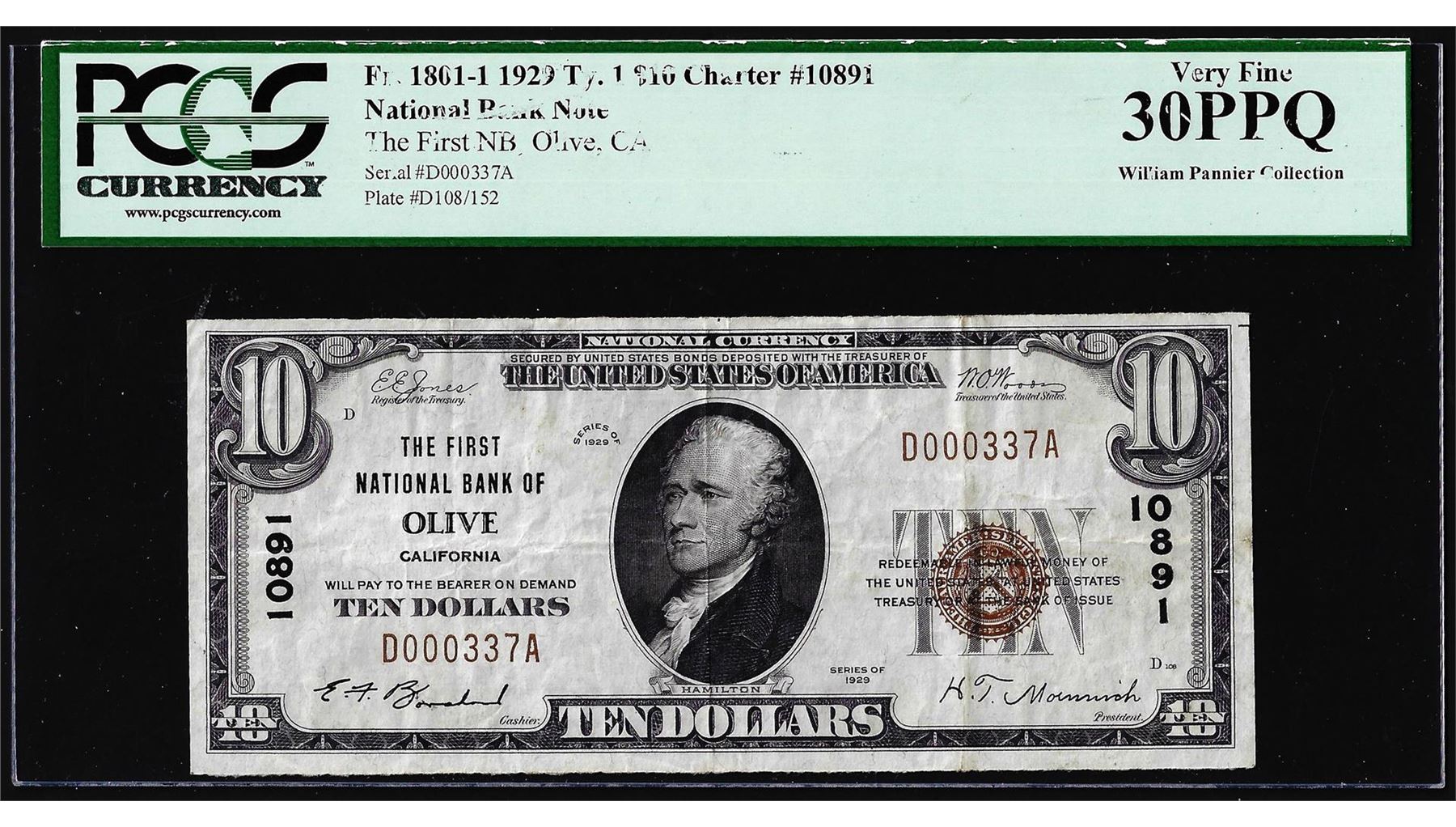 One 1929 $10 First NB of Olive, CA CH#10891 National Currency Note PCGS Very Fine 30PPQ. PCGS Graded.