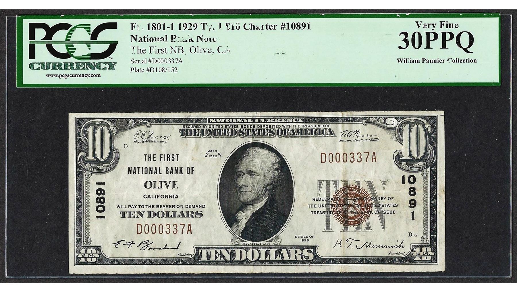 One 1929 $10 First NB of Olive, CA CH# 10891 National Currency Note PCGS Very Fine 30PPQ. PCGS Graded.