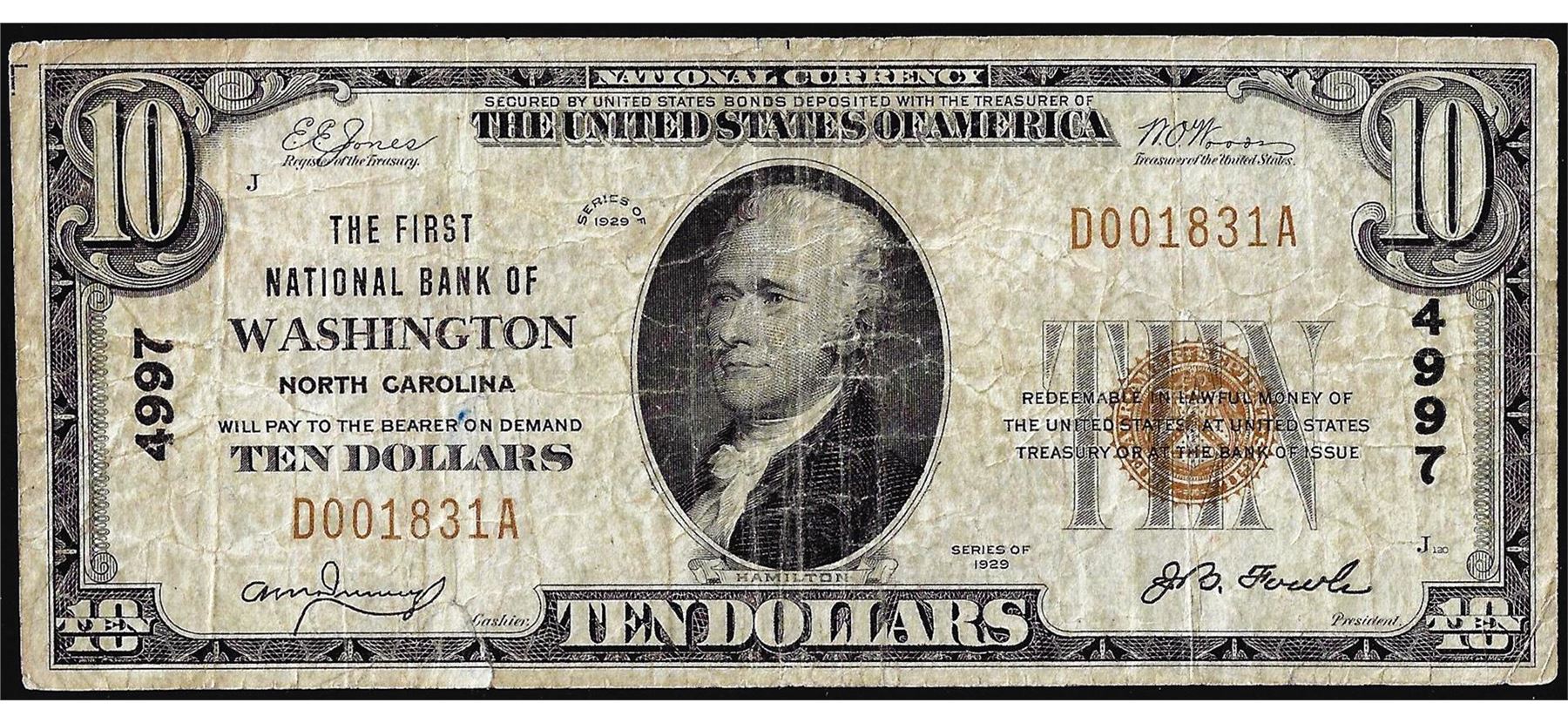 One 1929 $10 First NB of Washington, North Carolina CH# 4997 National Currency Note.