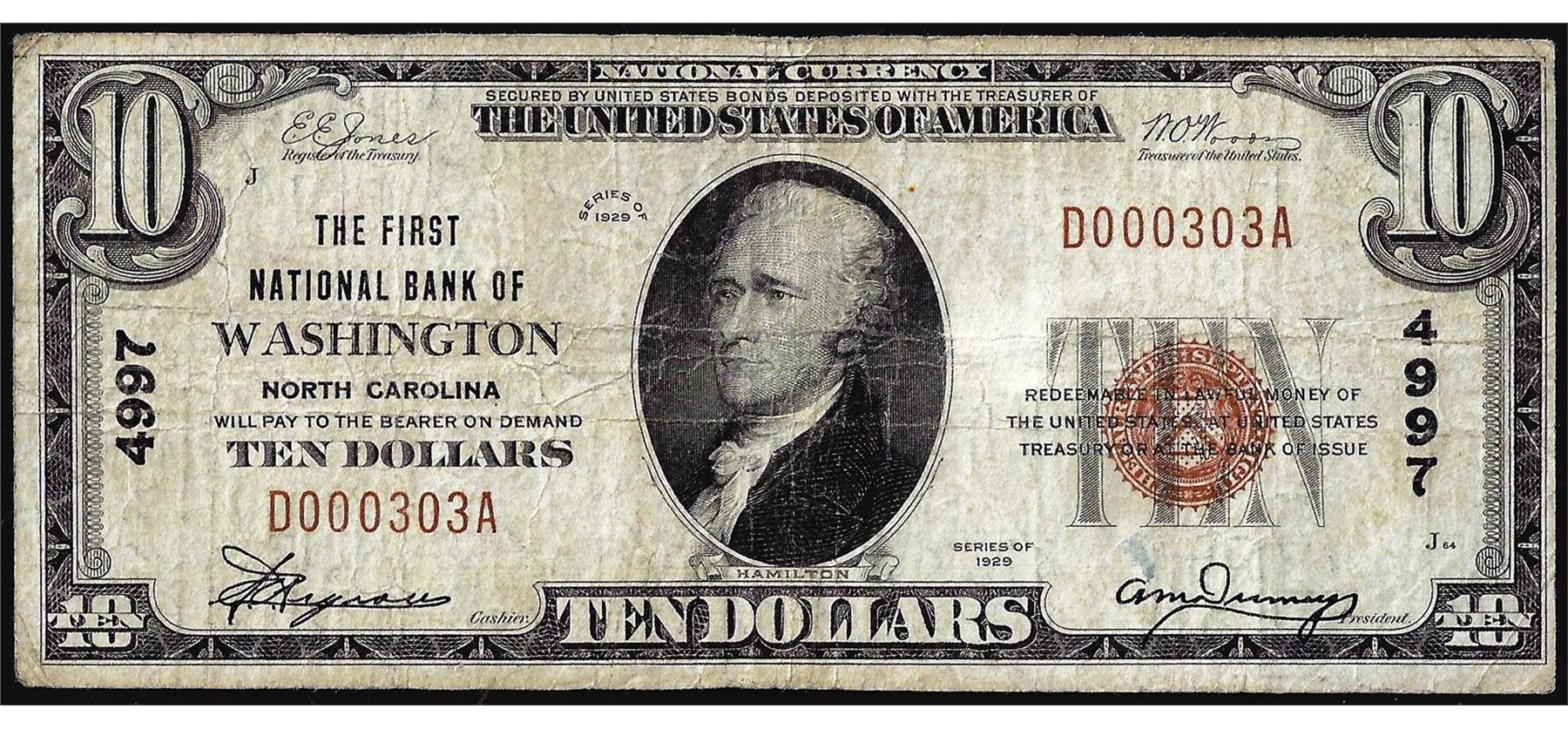 One 1929 $10 First NB of Washington, North Carolina CH# 4997 National Currency Note.