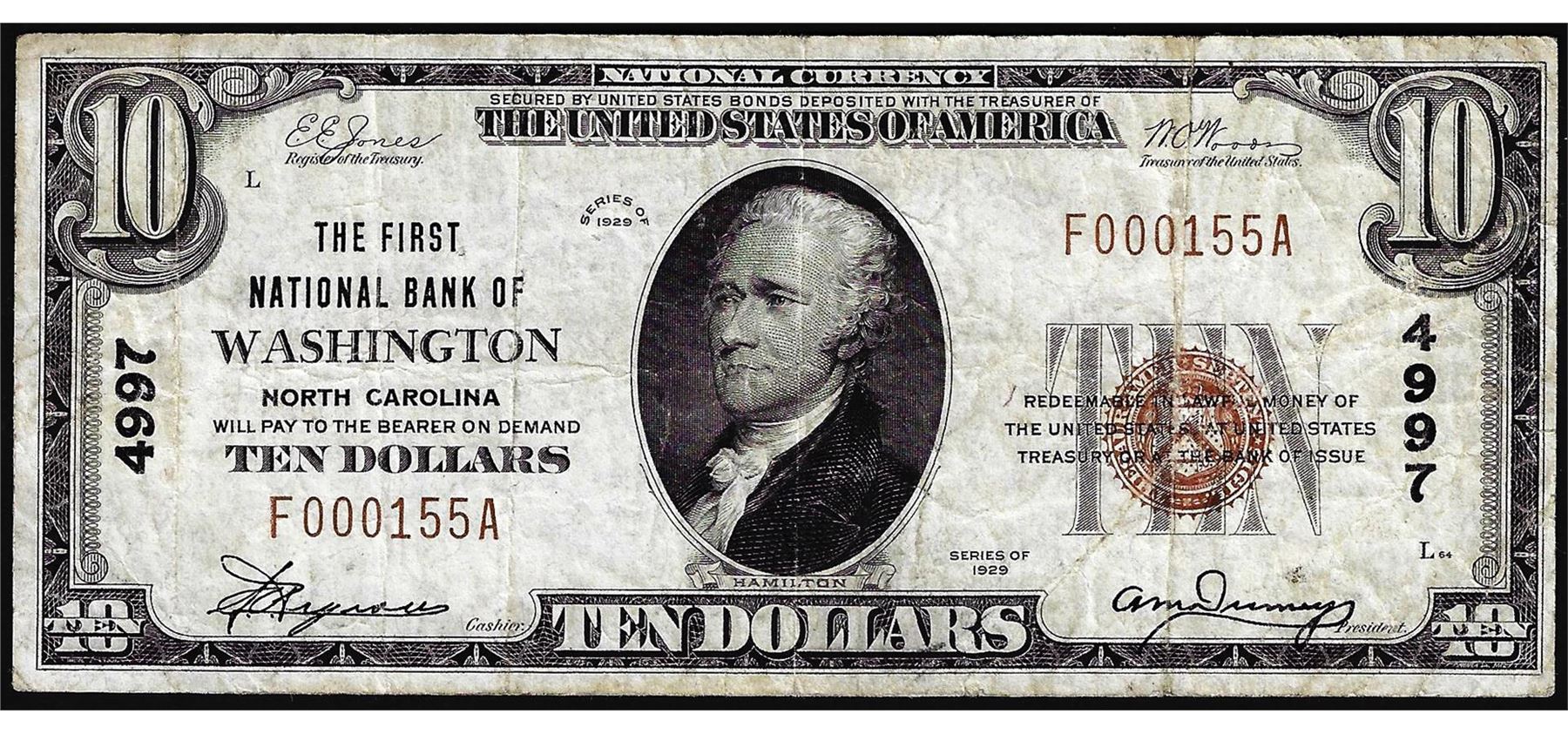 One 1929 $10 First NB of Washington, North Carolina CH# 4997 National Currency Note.