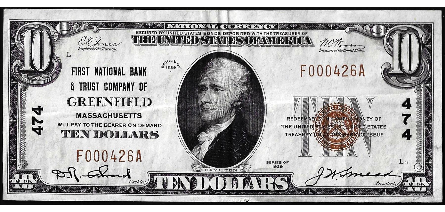 One 1929 $10 First National Bank & Trust of Greenfield, MA CH# 474 National Currency Note.