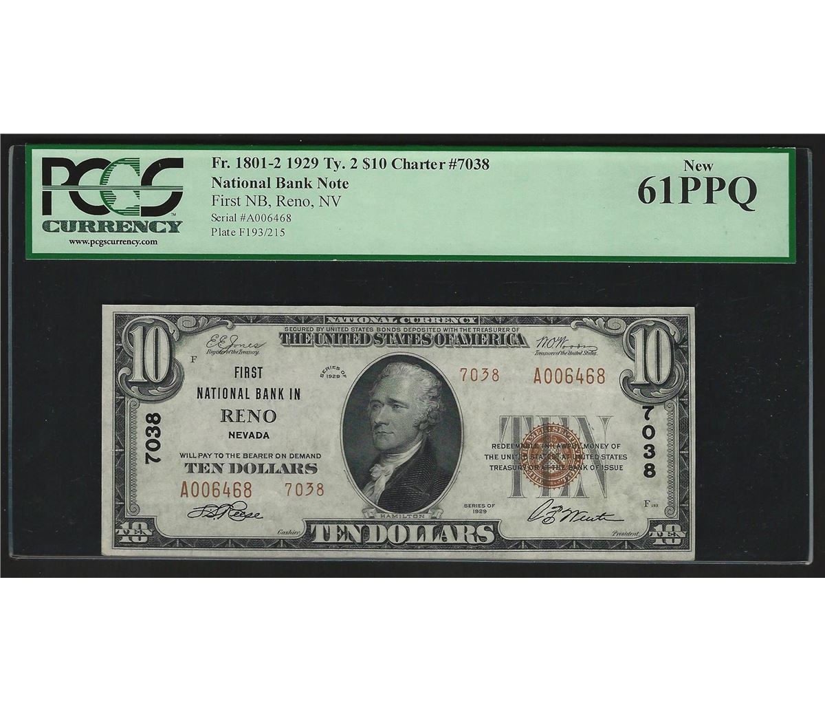 One 1929 $10 First National Bank in Reno Nevada National Currency Note PCGS New 61PPQ. PCGS Graded.