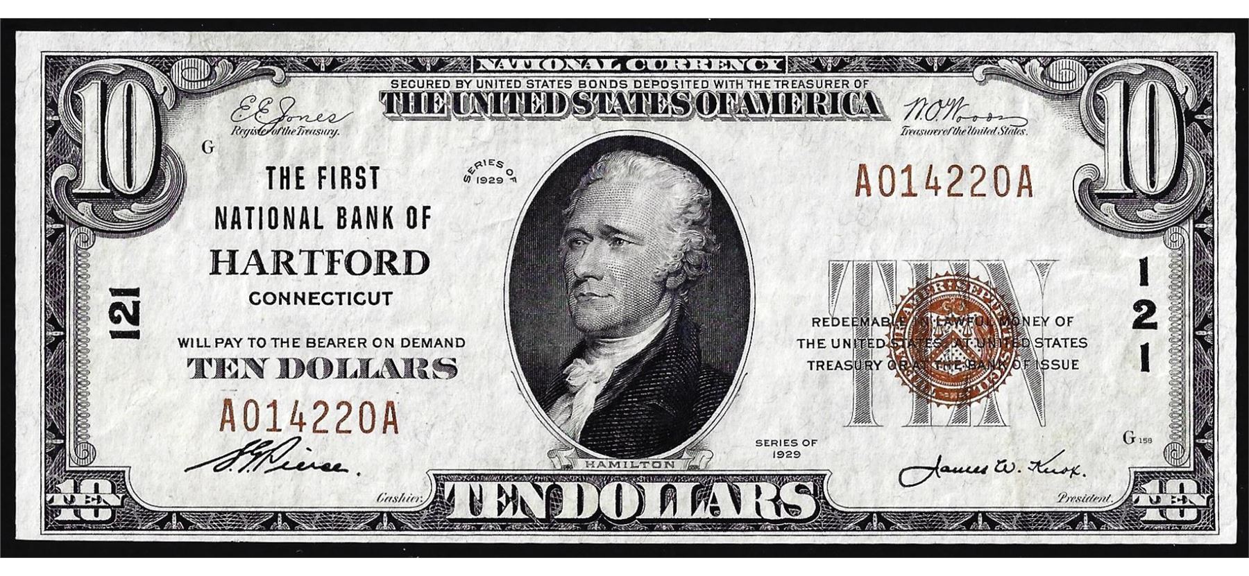 One 1929 $10 First National Bank of Hartford, CT CH #121 National Currency Note.