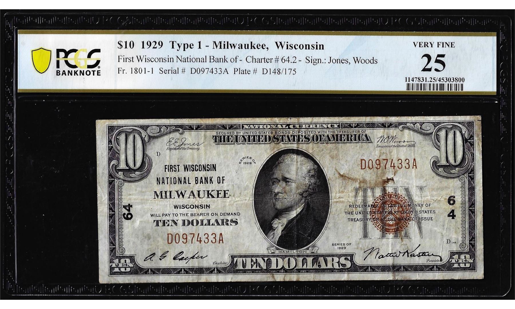 One 1929 $10 First Wisconsin NB Milwaukee, WI National Note CH# 64 PCGS Very Fine 25. PCGS Graded.