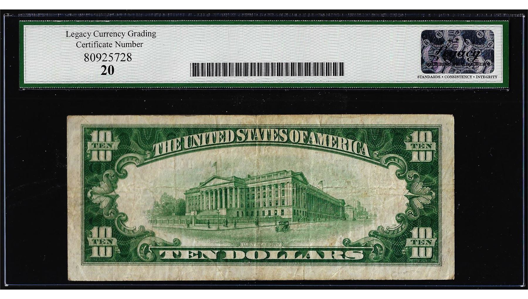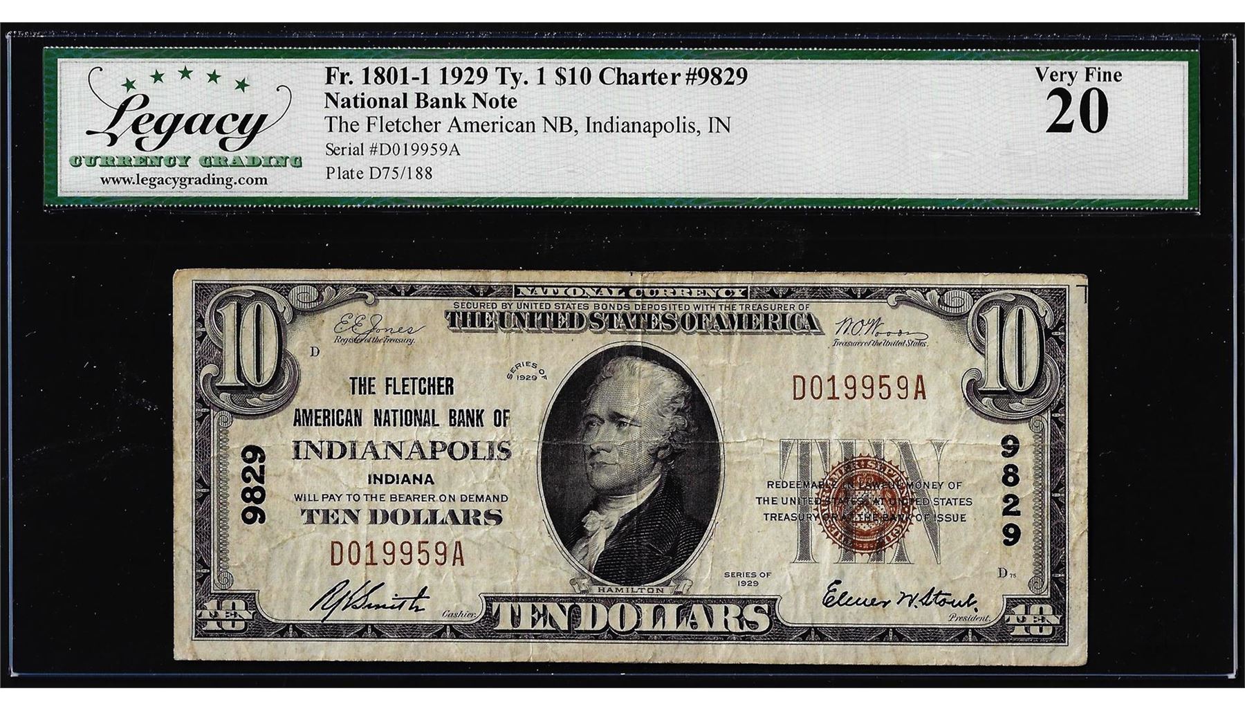One 1929 $10 Fletcher American NB Indianapolis, IN CH# 9829 National Note Legacy VF20. Legacy Graded.