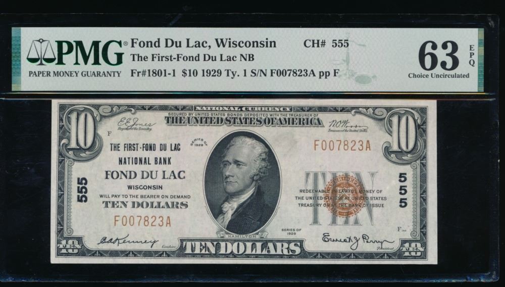 One 1929 $10 Fond Du Lac WI National PMG 63EPQ.