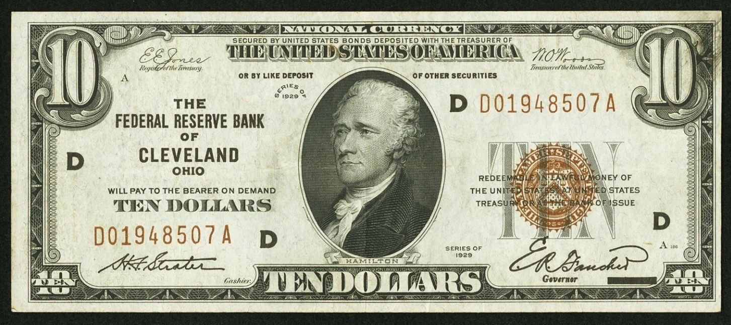 One 1929 $10 Fr. 1860-D Cleveland National Bank Note.