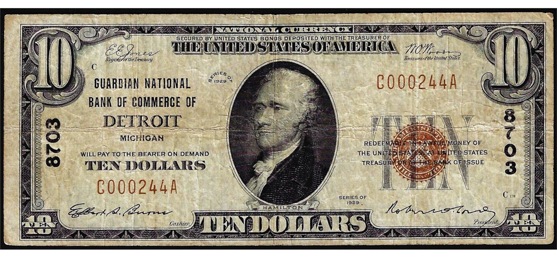One 1929 $10 Guardian NB of Commerce of Detroit, MI CH# 8703 National Currency Note.
