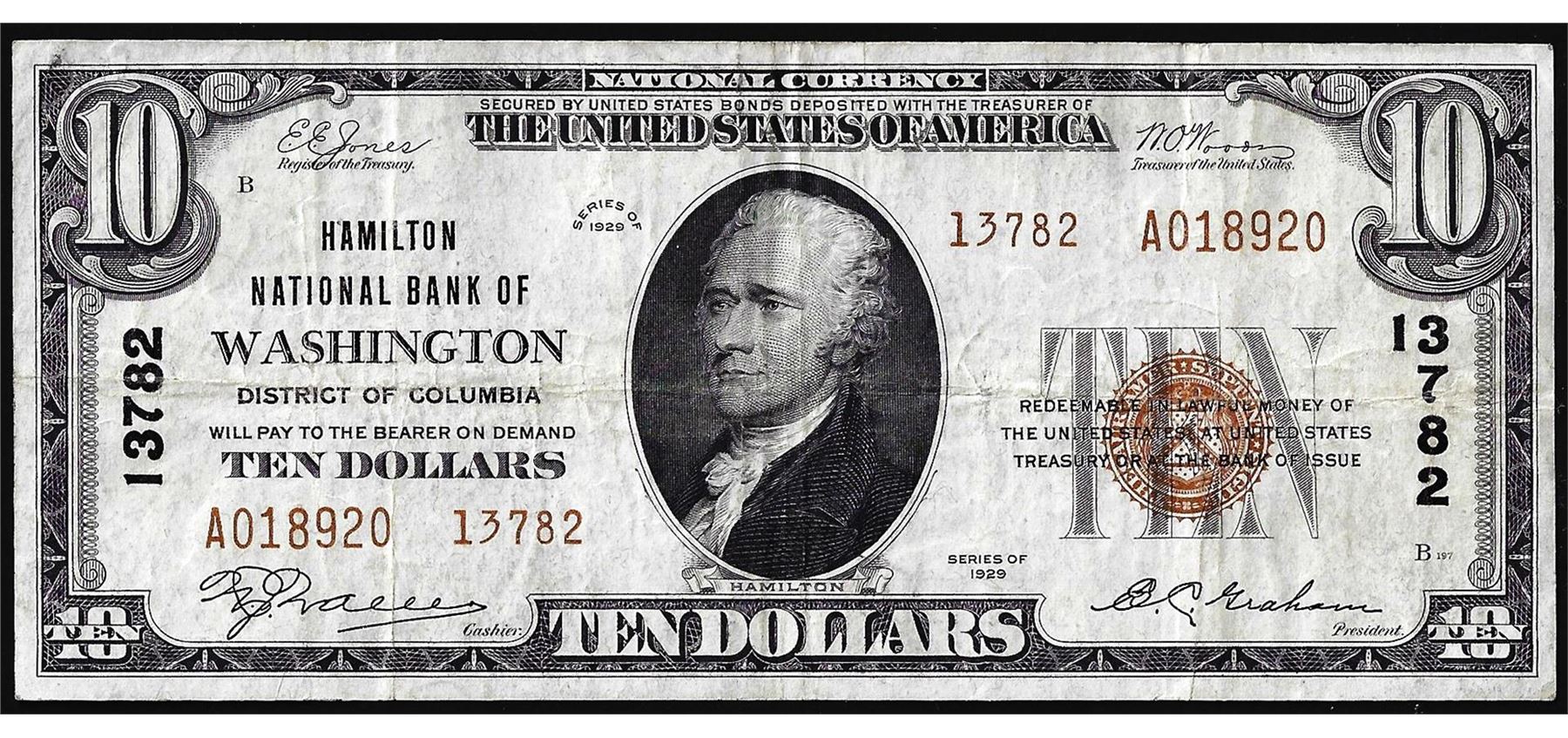 One 1929 $10 Hamilton NB of Washington, D.C. CH# 13782 National Currency Note.