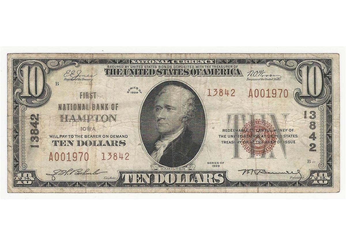 One 1929 $10 Hampton Iowa National Currency Note.