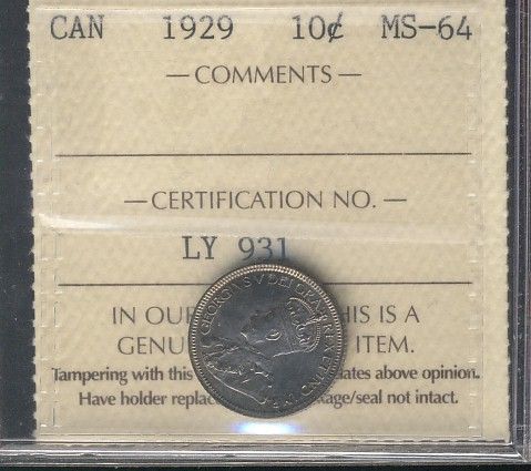 1929 10¢ ICCS MS64. Light hue of gold and pink.