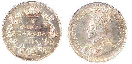 1929 10¢ ICCS MS66, a bit of toning. Great lustre and fields.