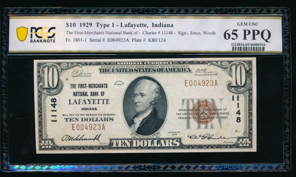 One 1929 $10 Lafayette IN National PCGS 65PPQ.