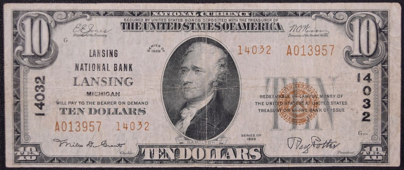 One 1929 $10 Lansing National Bank Note.