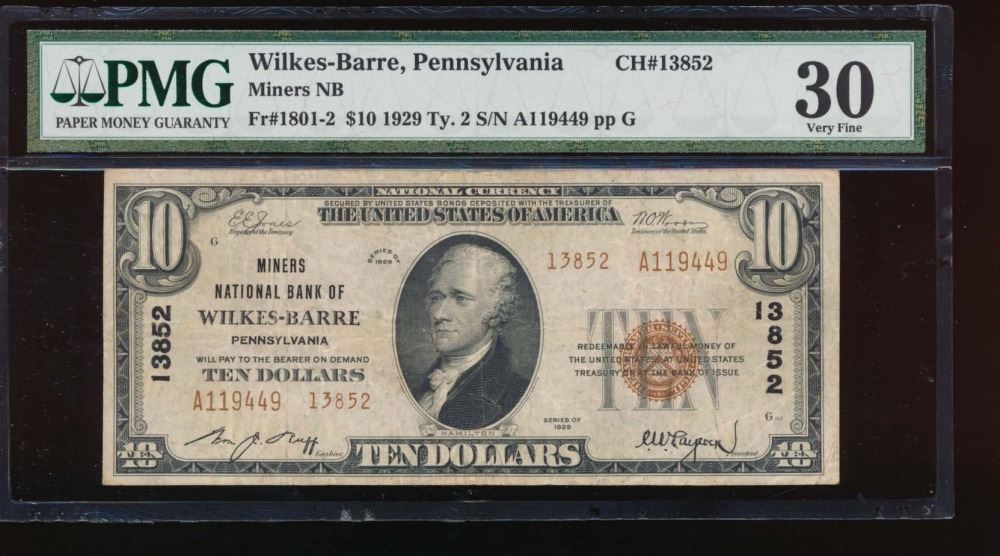 One 1929 $10 Miners Nation Bank Note PMG 30.