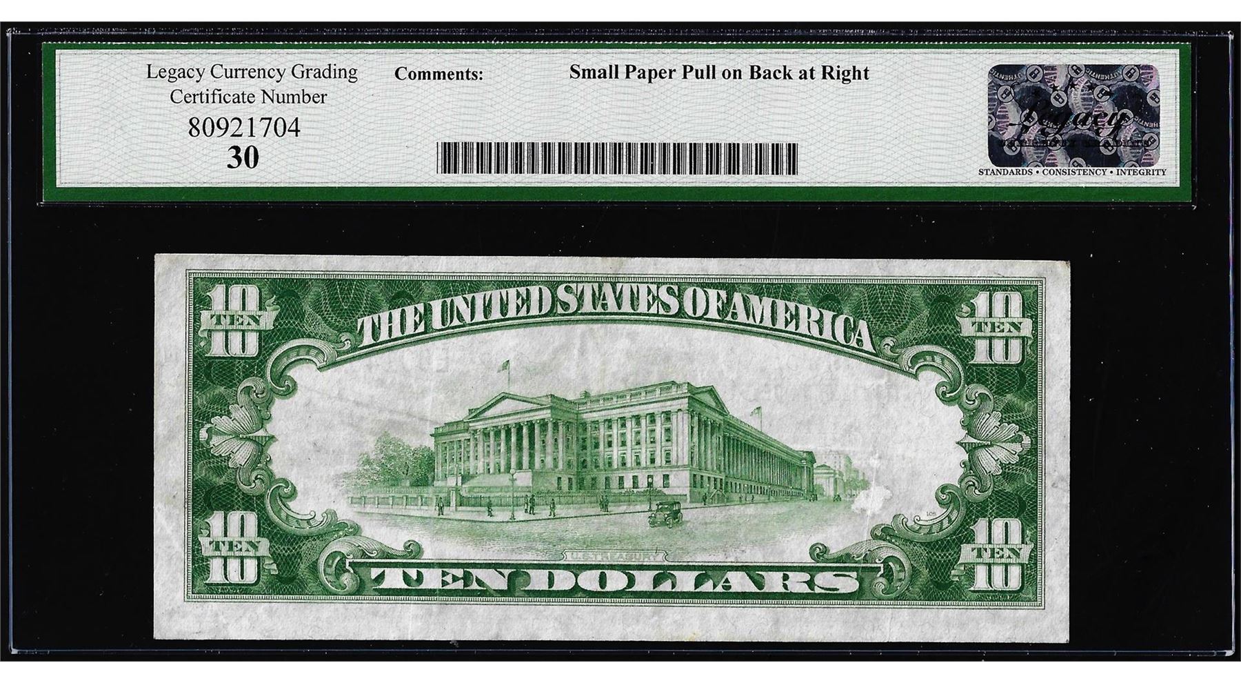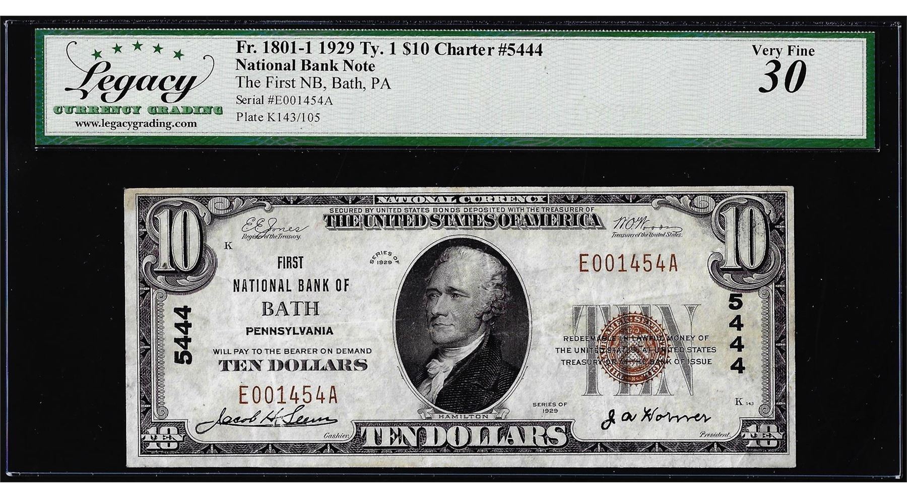 One 1929 $10 NB Bath, PA CH# 5444 Fr.1801-1 National Currency Note Legacy Very Fine 30. Legacy Graded.
