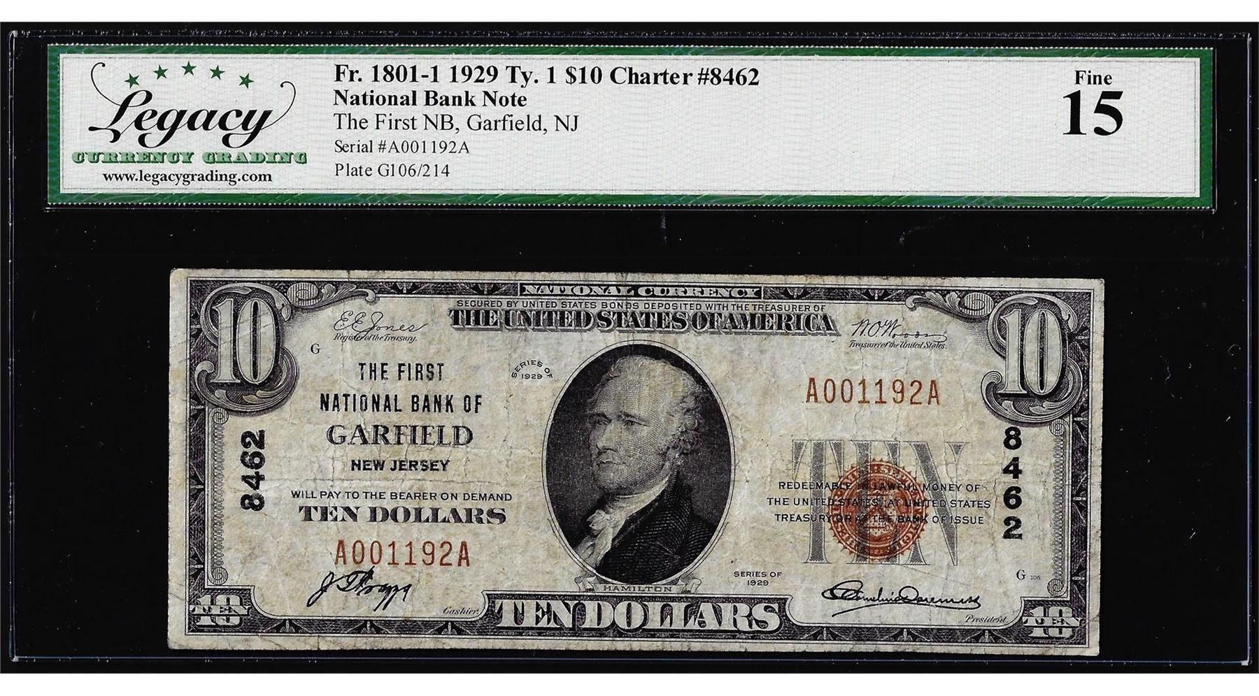 One 1929 $10 NB Garfield, NJ CH# 8462 Fr.1801-1 National Currency Note Legacy Fine 15. Legacy Graded.