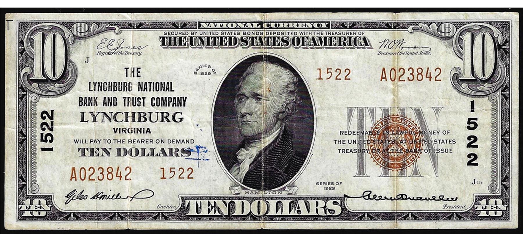 One 1929 $10 NB Lynchburg, VA CH# 1522 National Currency Note.