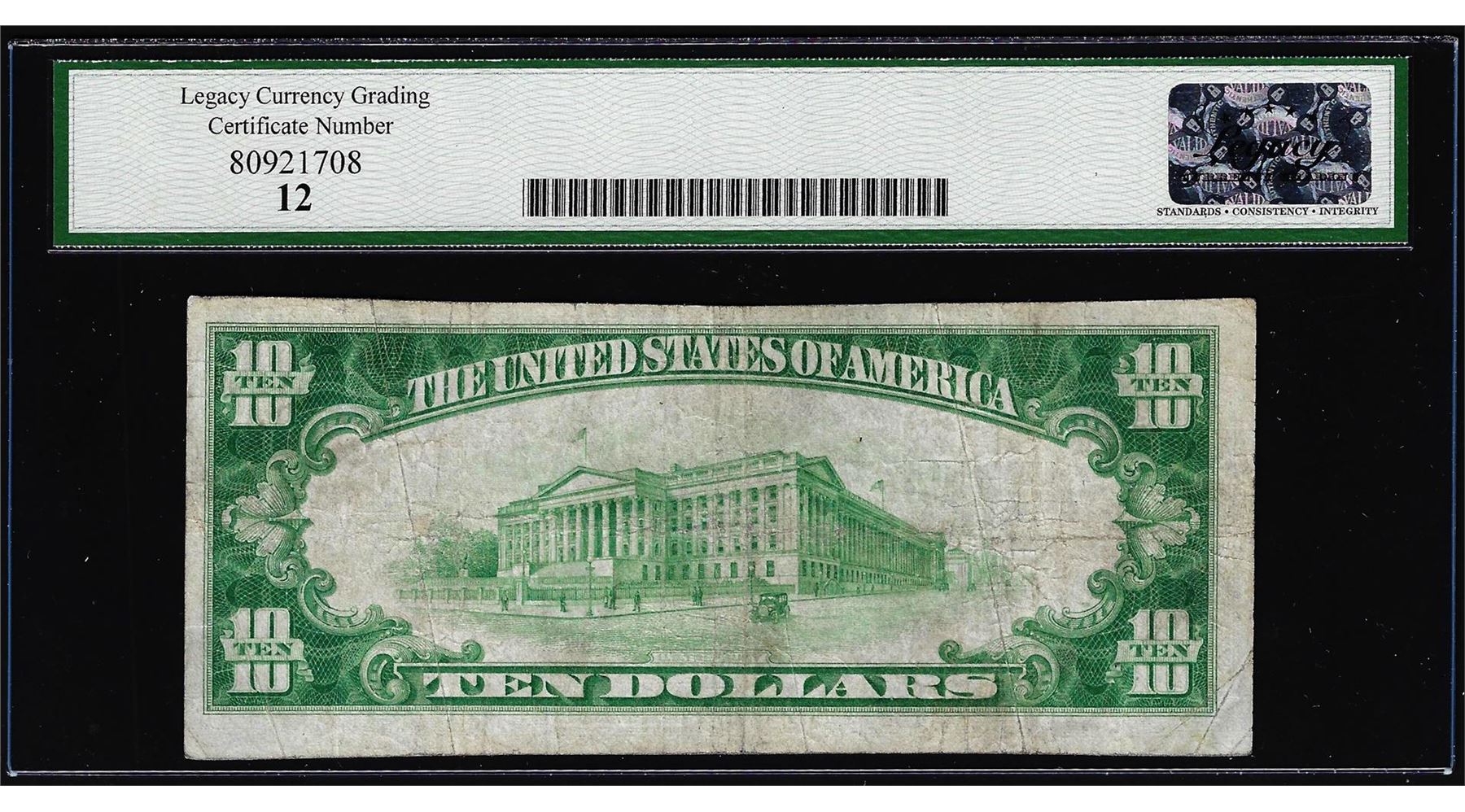 One 1929 $10 NB Penbrook, PA CH# 12197 Fr.1801-1 National Currency Note Legacy Fine 12. Legacy Graded.