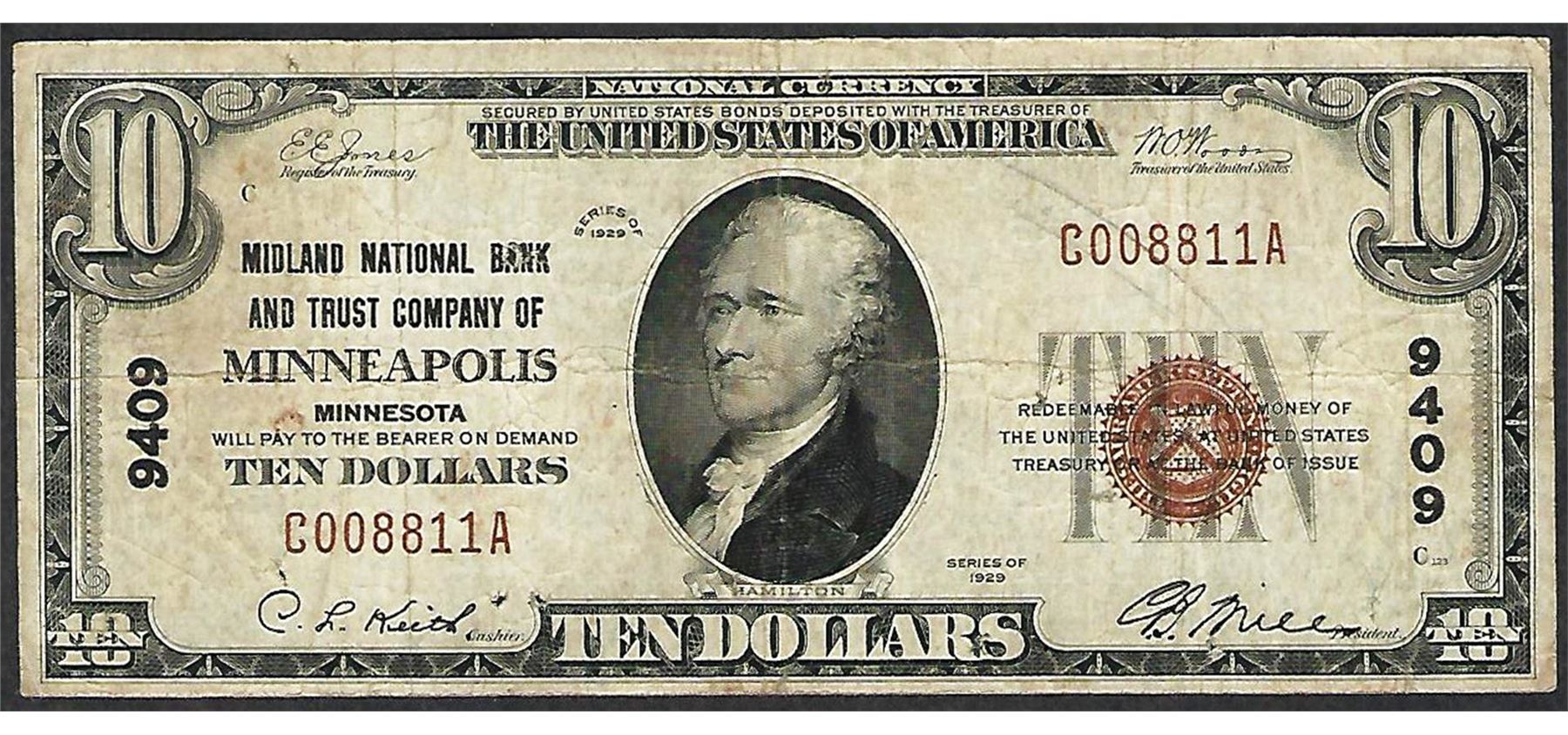 One 1929 $10 NB & Trust Company of Minneapolis, MN CH# 9409 National Currency Note.