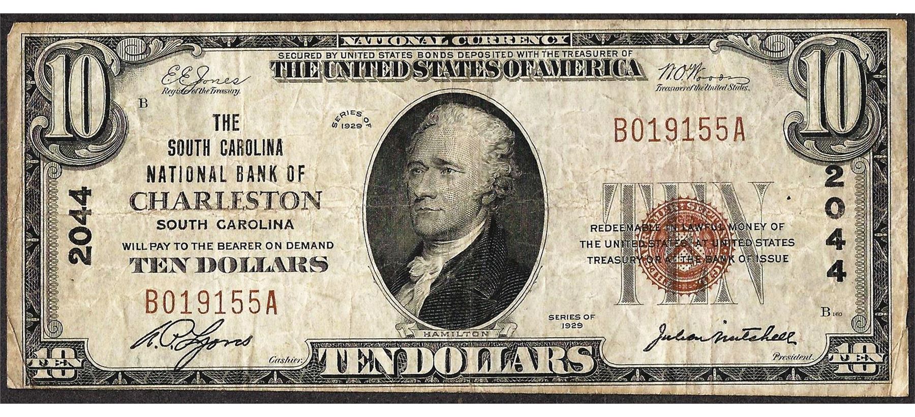 1929 $10 NB of Charleston, South Carolina CH# 2044 National Currency Note