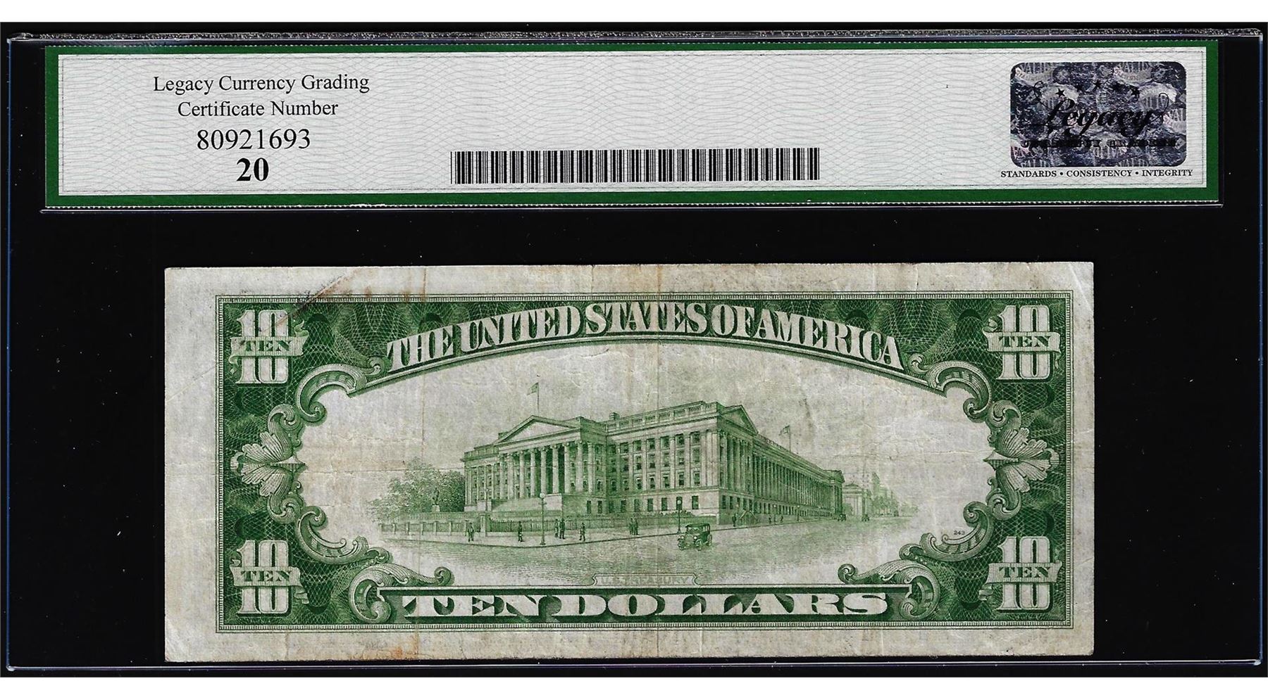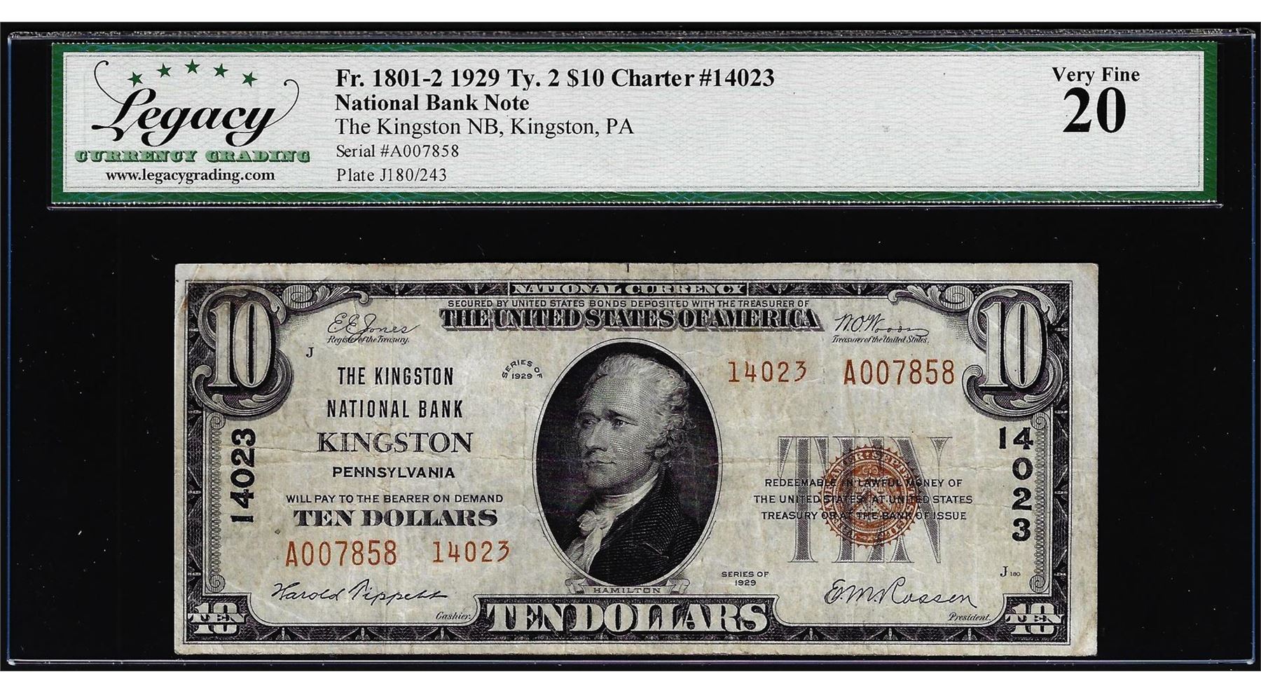 One 1929 $10 NB of Kingston, PA CH# 14023 National Currency Note Legacy Very Fine 20. Legacy Graded.