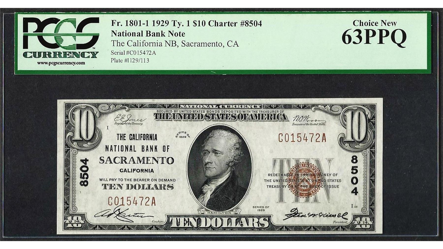 One 1929 $10 NB of Sacramento, CA CH# 8504 National Currency Note PCGS Choice New 63PPQ. PCGS Graded.