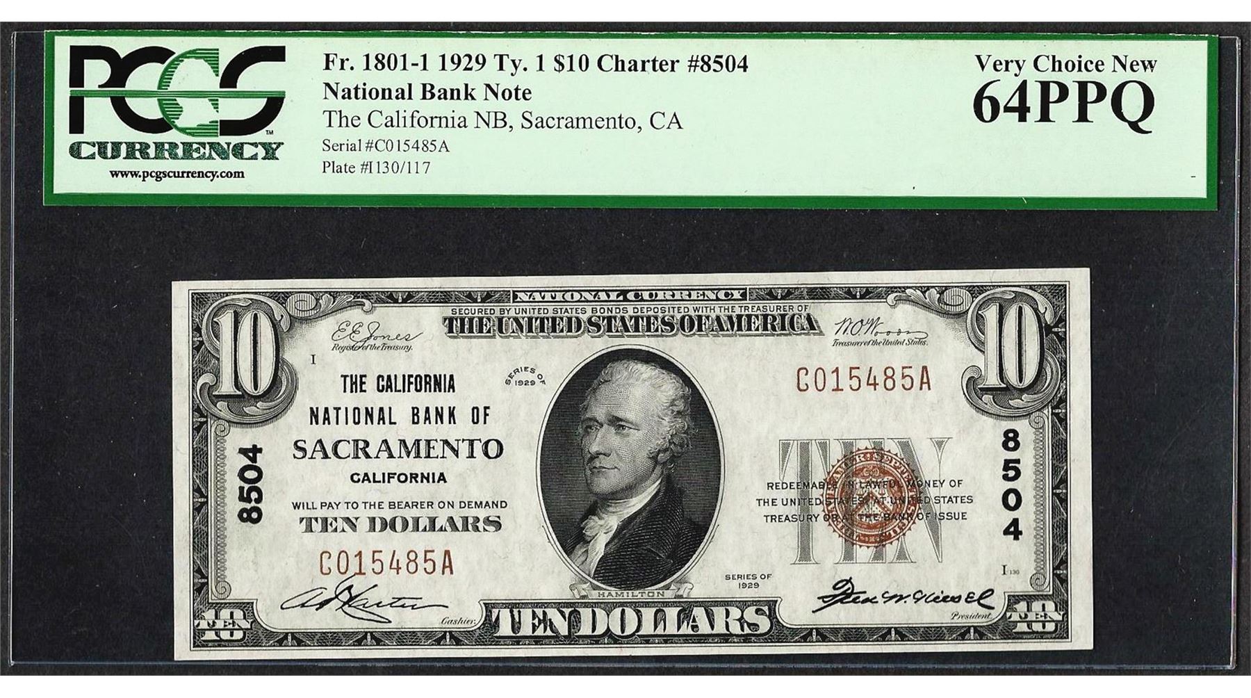 One 1929 $10 NB of Sacramento, CA CH# 8504 National Currency Note PCGS Very Choice New 64PPQ. PCGS Graded.