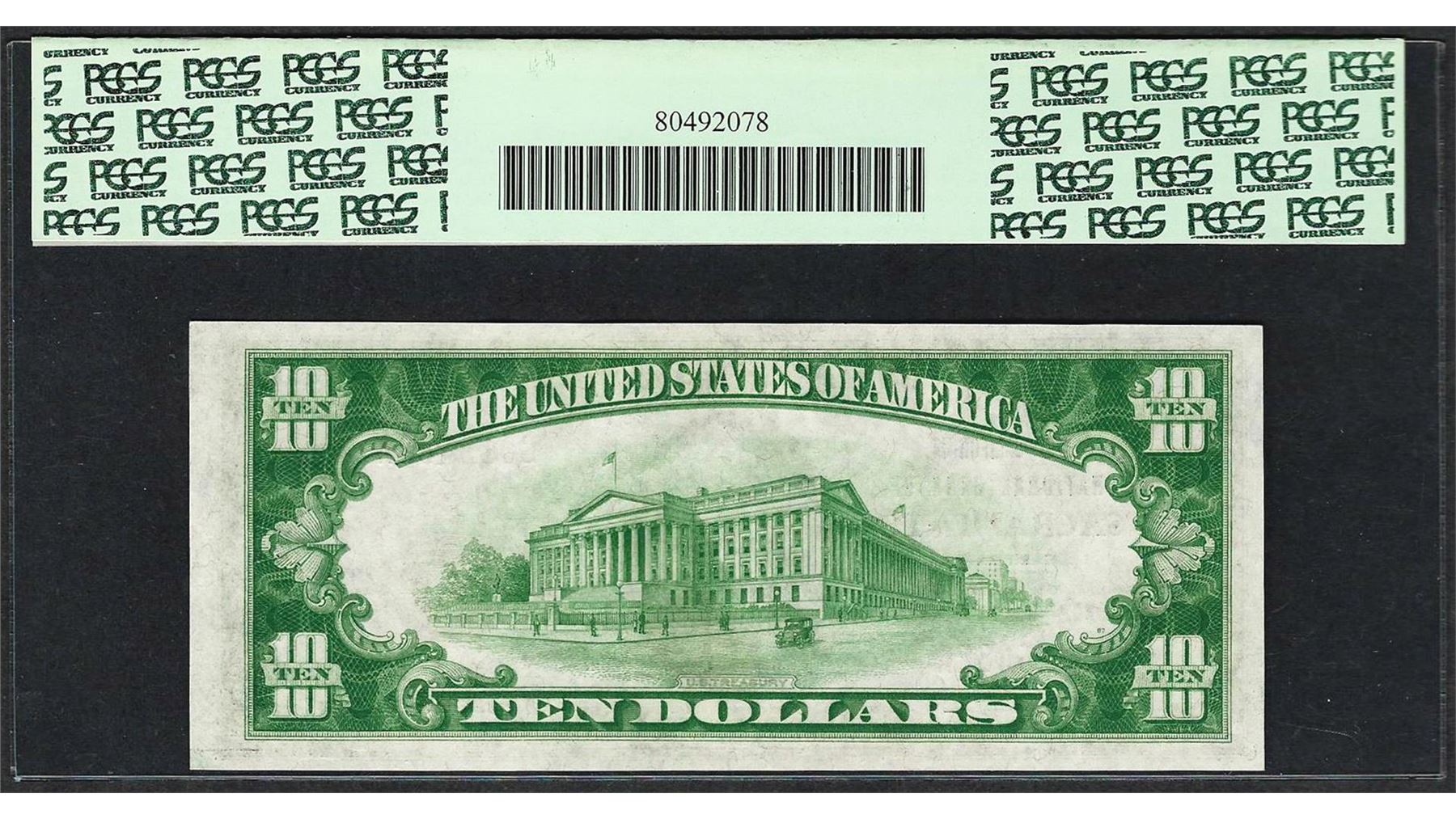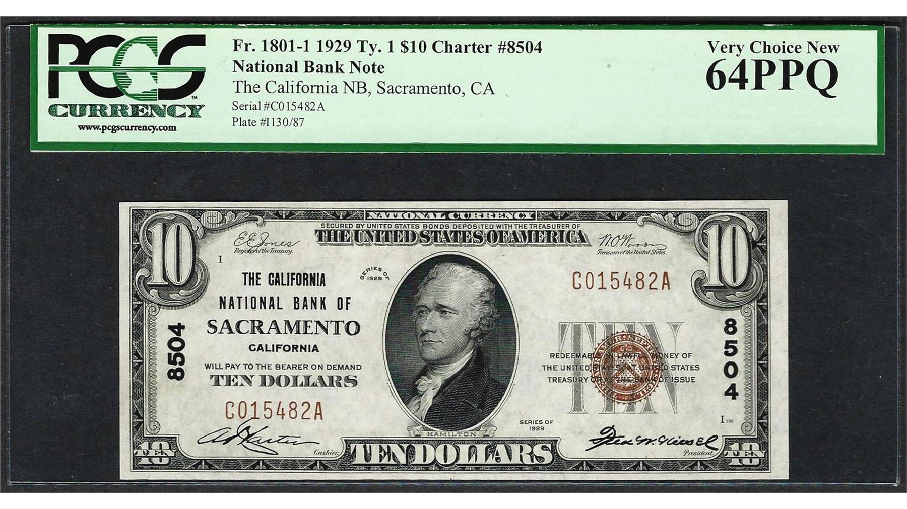 One 1929 $10 NB of Sacramento, CA CH# 8504 National Currency Note PCGS Very Choice New 64PPQ. PCGS Graded.