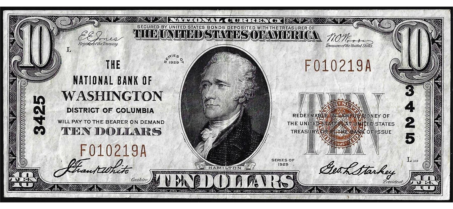 One 1929 $10 NB of Washington, District of Columbia CH# 3425 National Currency Note.