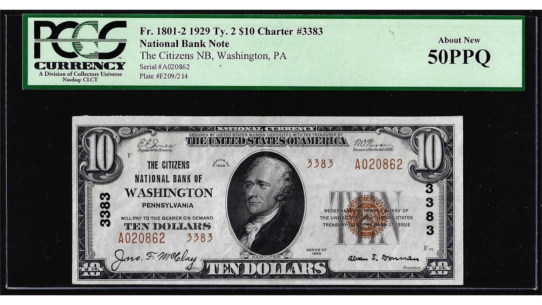 One 1929 $10 NB of Washington, PA CH# 3383 National Currency Note PCGS About New 50PPQ. PCGS Graded.