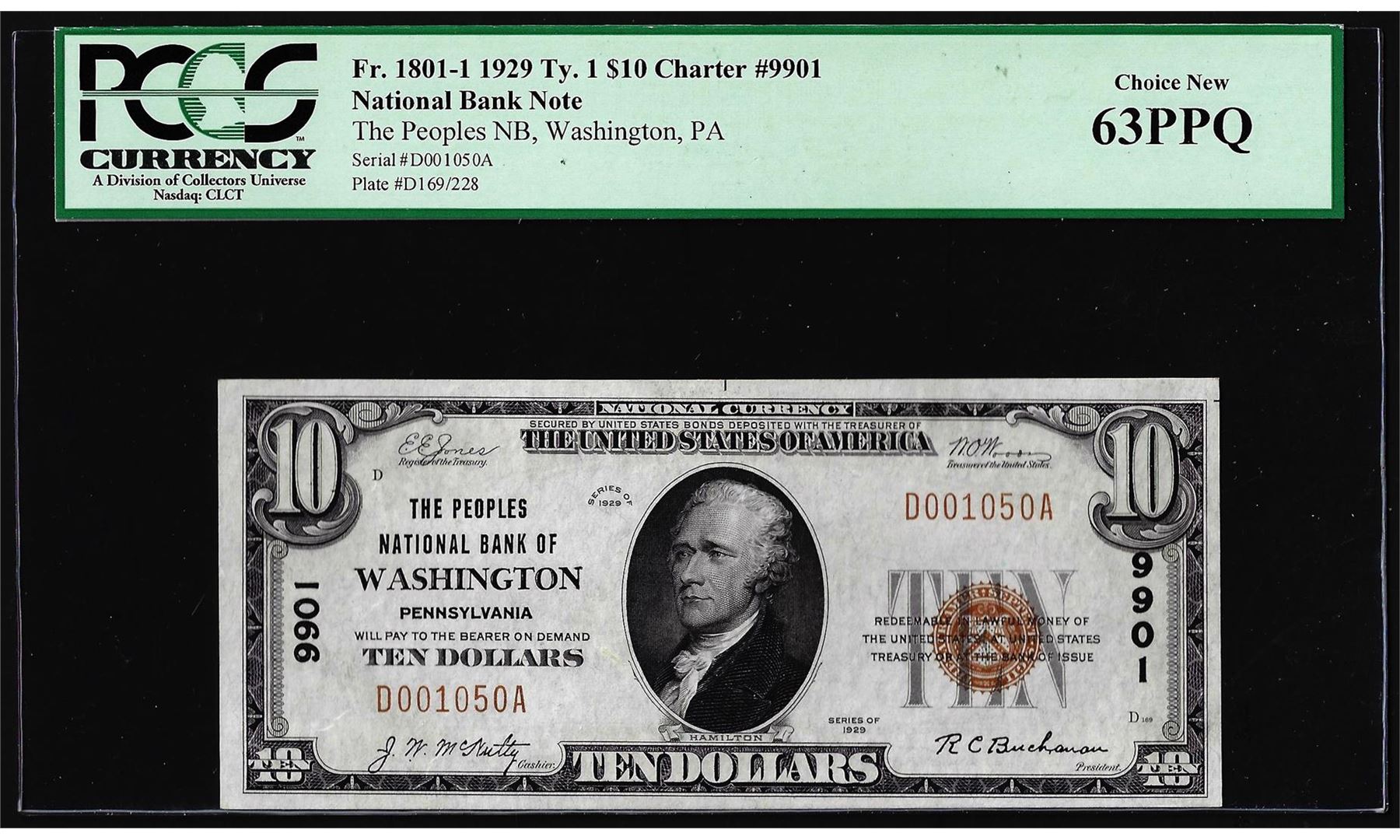 One 1929 $10 NB of Washington, PA CH# 9901 National Currency Note PCGS Choice New 63PPQ. PCGS Graded.