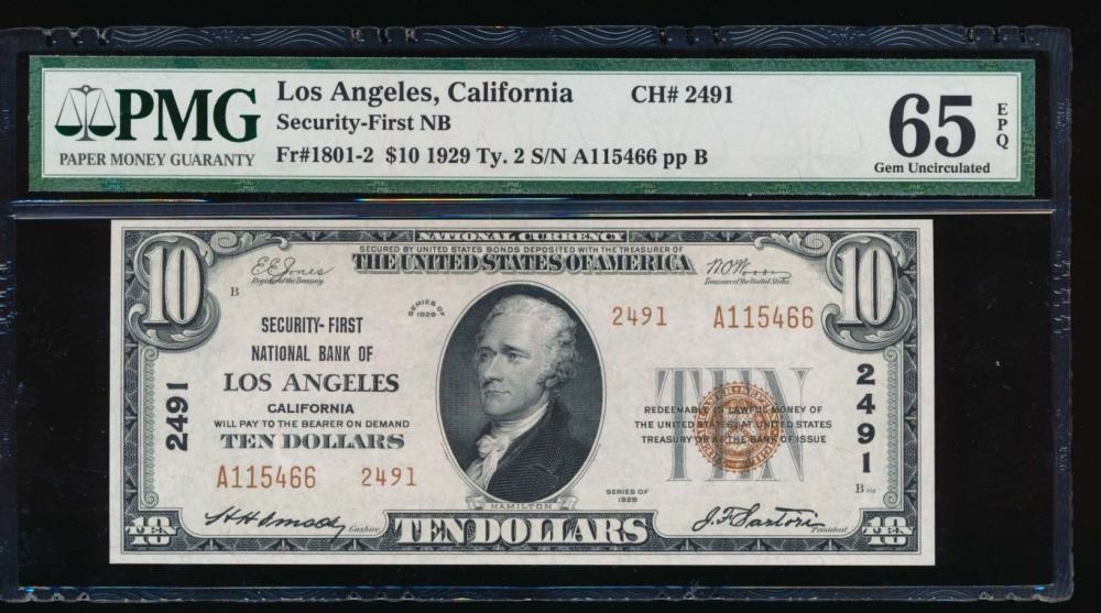 One 1929 $10 Nation Bank of Los Angeles Note PMG 65EPQ.