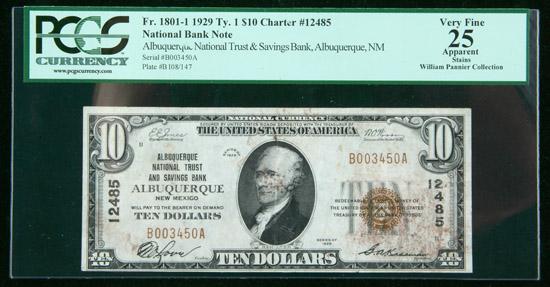1929, $10 National Bank Note. Albuquerque NT & SB, Albuquerque, NM. PCGS Apparent Very Fine 25. . Fr-1801-1. Although some staining is present, this is a scarcer city to locate in all grades or series.