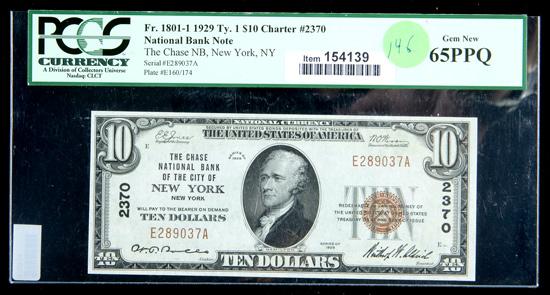 1929, $10 National Bank Note. The Chase NB, New York, NY. PCGS Gem New 65PPQ. . Fr-1801-1. . KL-1243. This is a boldly embossed, Gem example from a common New York bank. It is ideal for a Gem small size type or state collection.