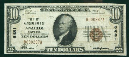 1929, $10 National Bank Note. The First NB, Anaheim, CA