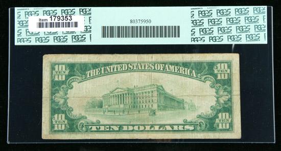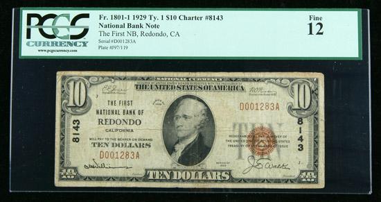 1929, $10 National Bank Note. The First NB, Redondo, CA. Ch. #8143. PCGS Fine 12. . Fr-1801-1. A scarce note from this L.A. County bank that is available far less often than its census population of nearly two dozen small size notes would indicate.