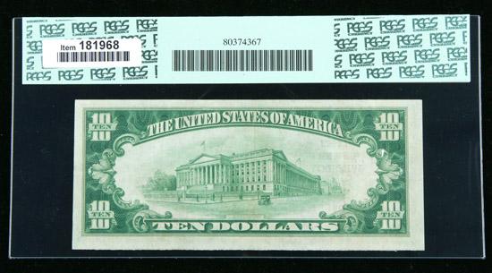 1929, $10 National Bank Note. The First NB, Winslow, AZ. Ch. #12581. PCGS Extremely Fine 40PPQ. . Fr-1801-1. This cataloger doesn't see any girls or Fords, or street corners for that matter, while typing up the description for these Winslow notes, but this is certainly a nice note. It is fully original and has only a few light folds that are commensurate with the assigned grade. Perfect for any Arizona collector, or Eagles fan, as the case may be.