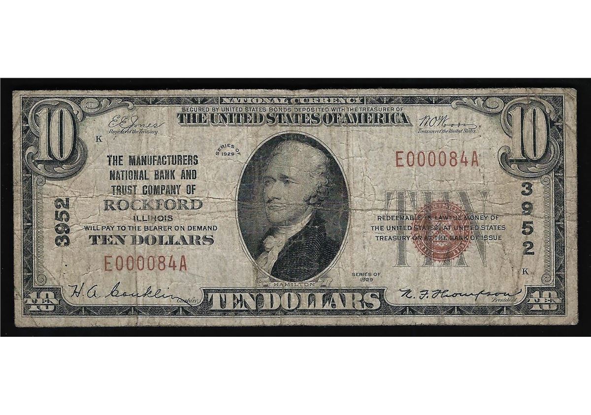 One 1929 $10 National Bank and Trust of Rockford Illinois National Currency Note.