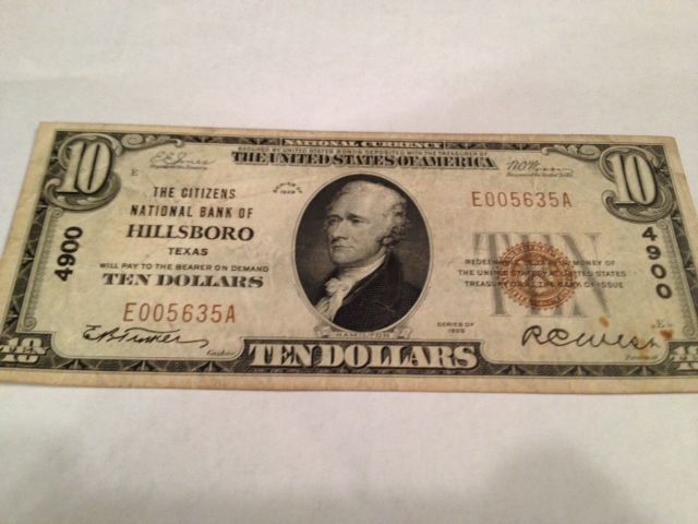 1929 $10 National Bank of Hillsboro Tx Note