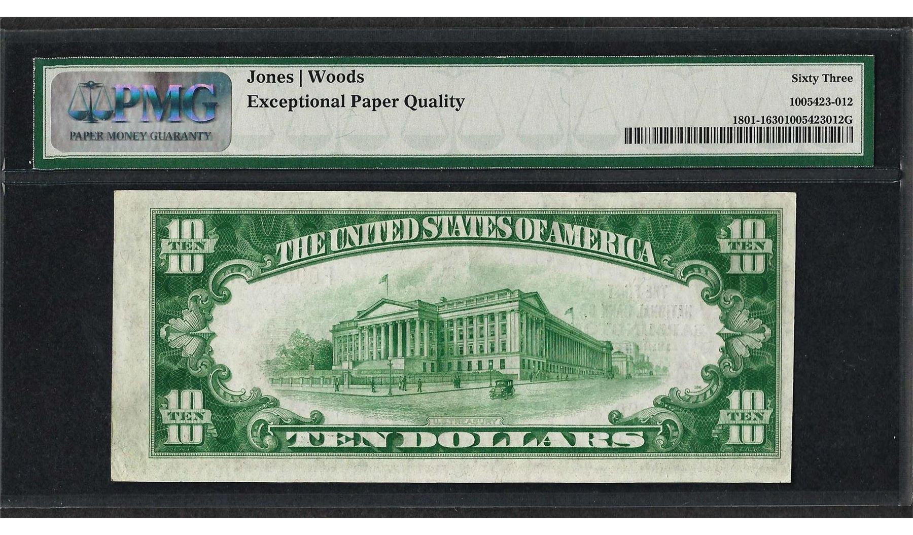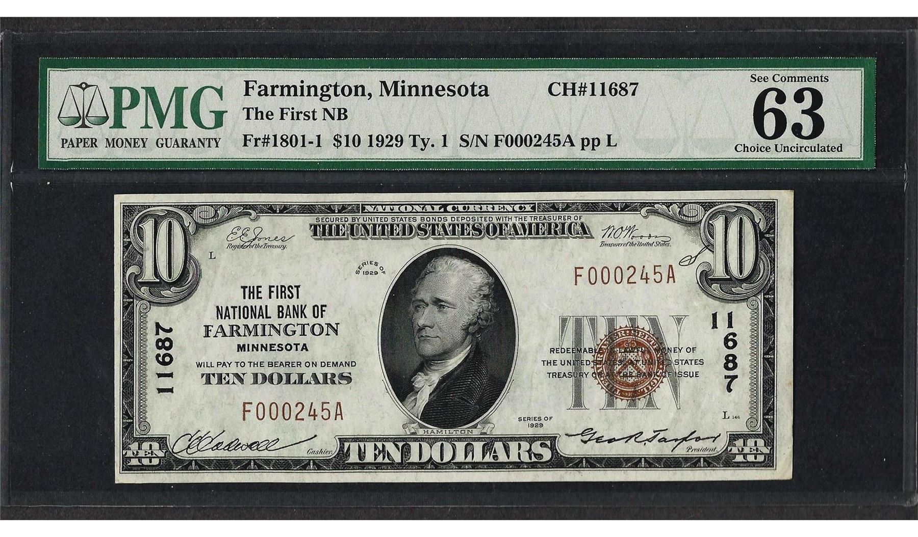 One 1929 $10 National Currency Note Farmington, MN CH# 11687 PMG Choice Uncirculated 63EPQ. PMG Certified.