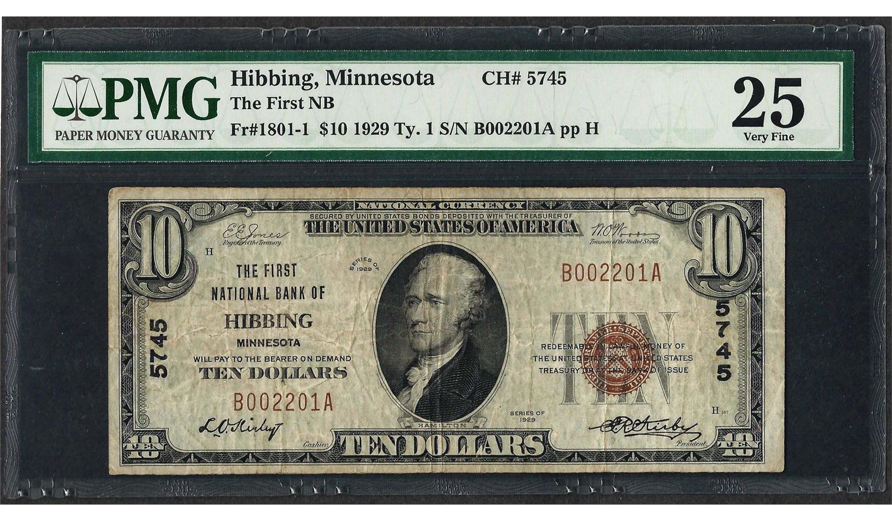 One 1929 $10 National Currency Note Hibbing, MN CH# 5745 PMG Very Fine 25. PMG Certified.
