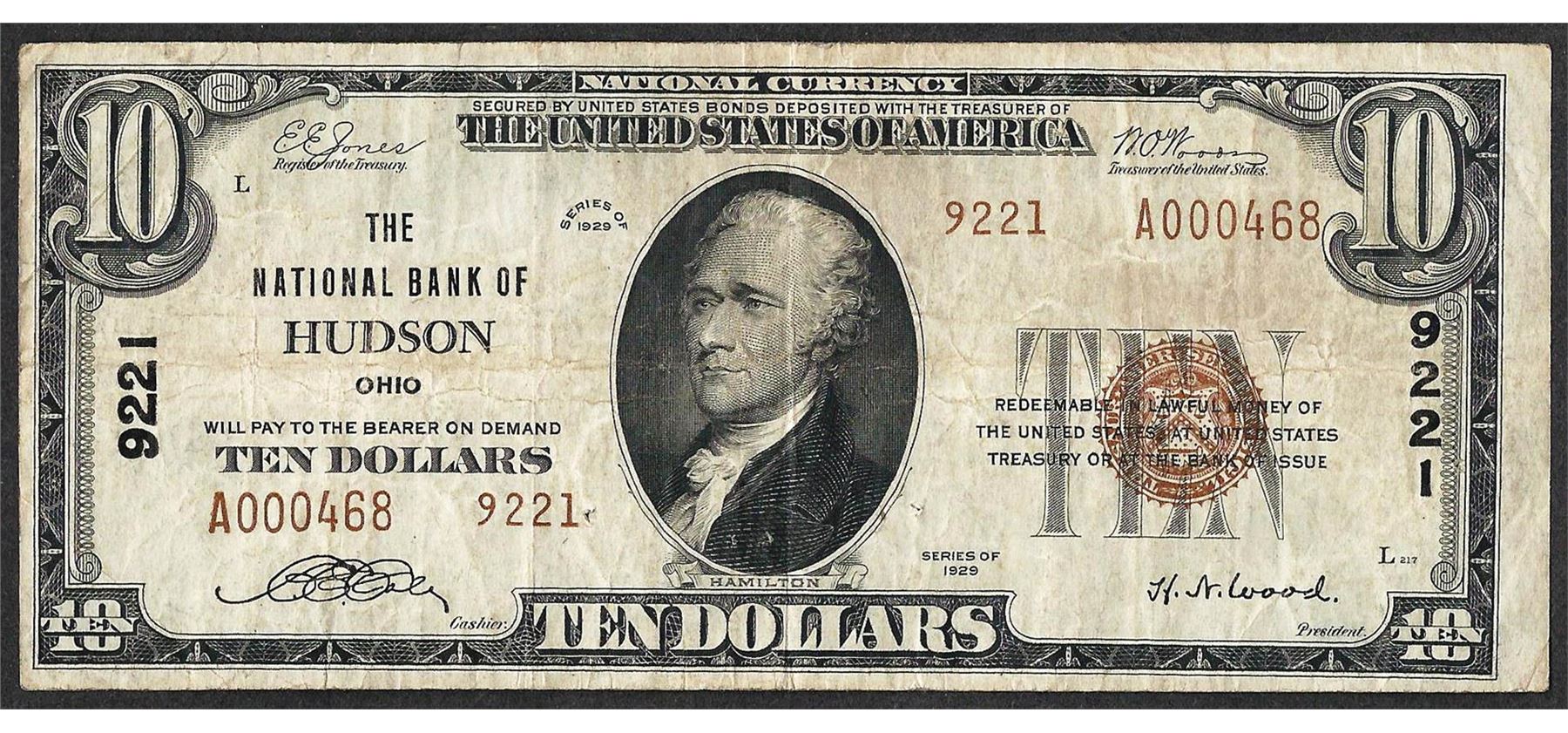 One 1929 $10 National Currency Note Hudson, OH CH# 9221.