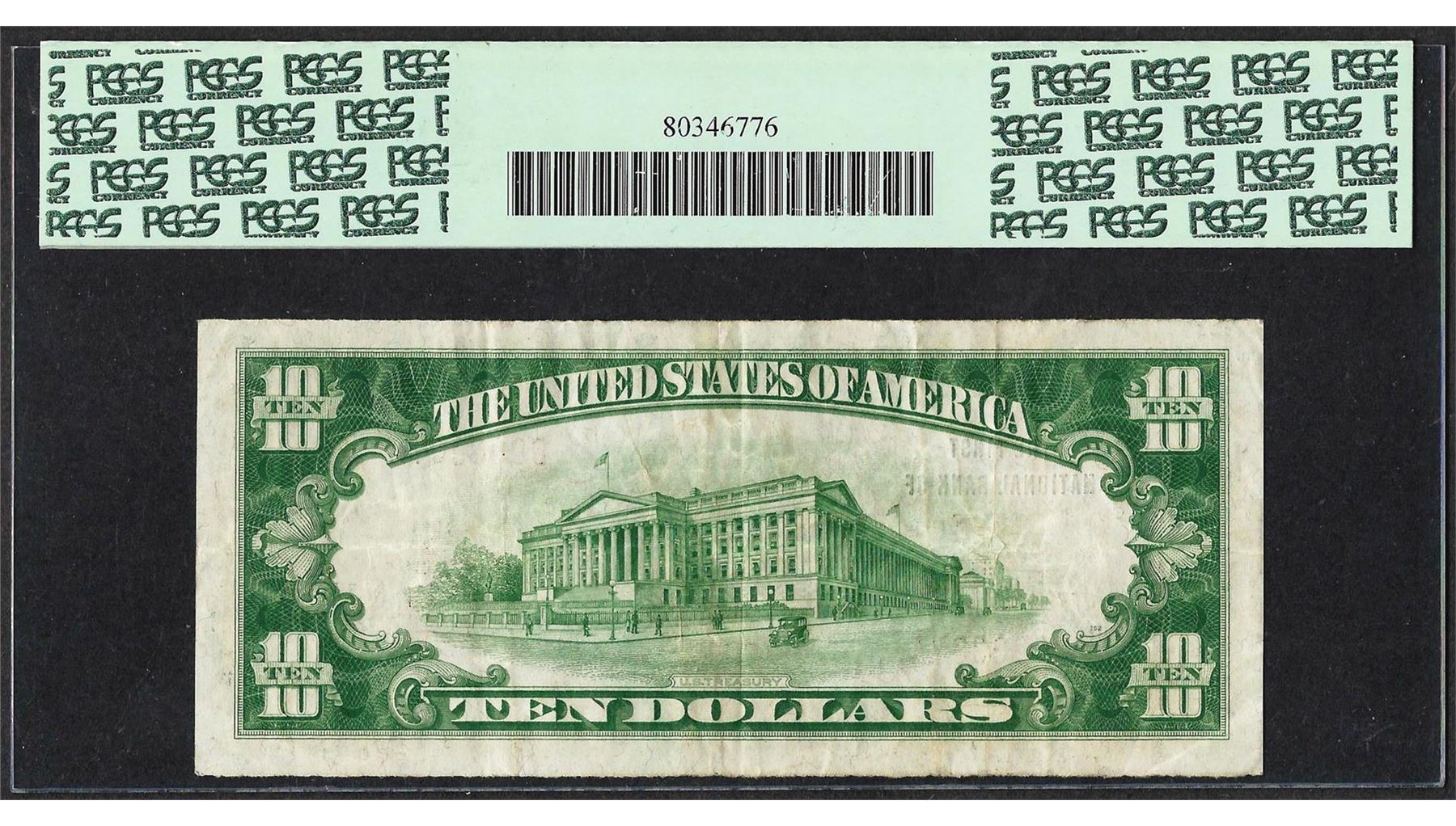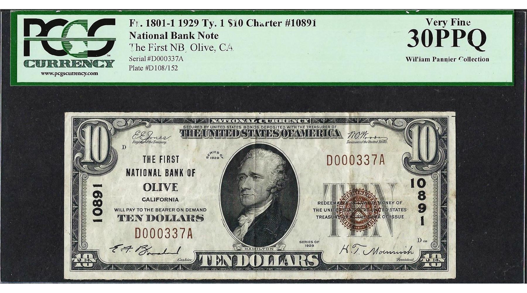 One 1929 $10 National Currency Note Olive, CA CH# 10891 PCGS Very Fine 30PPQ. PCGS Graded.