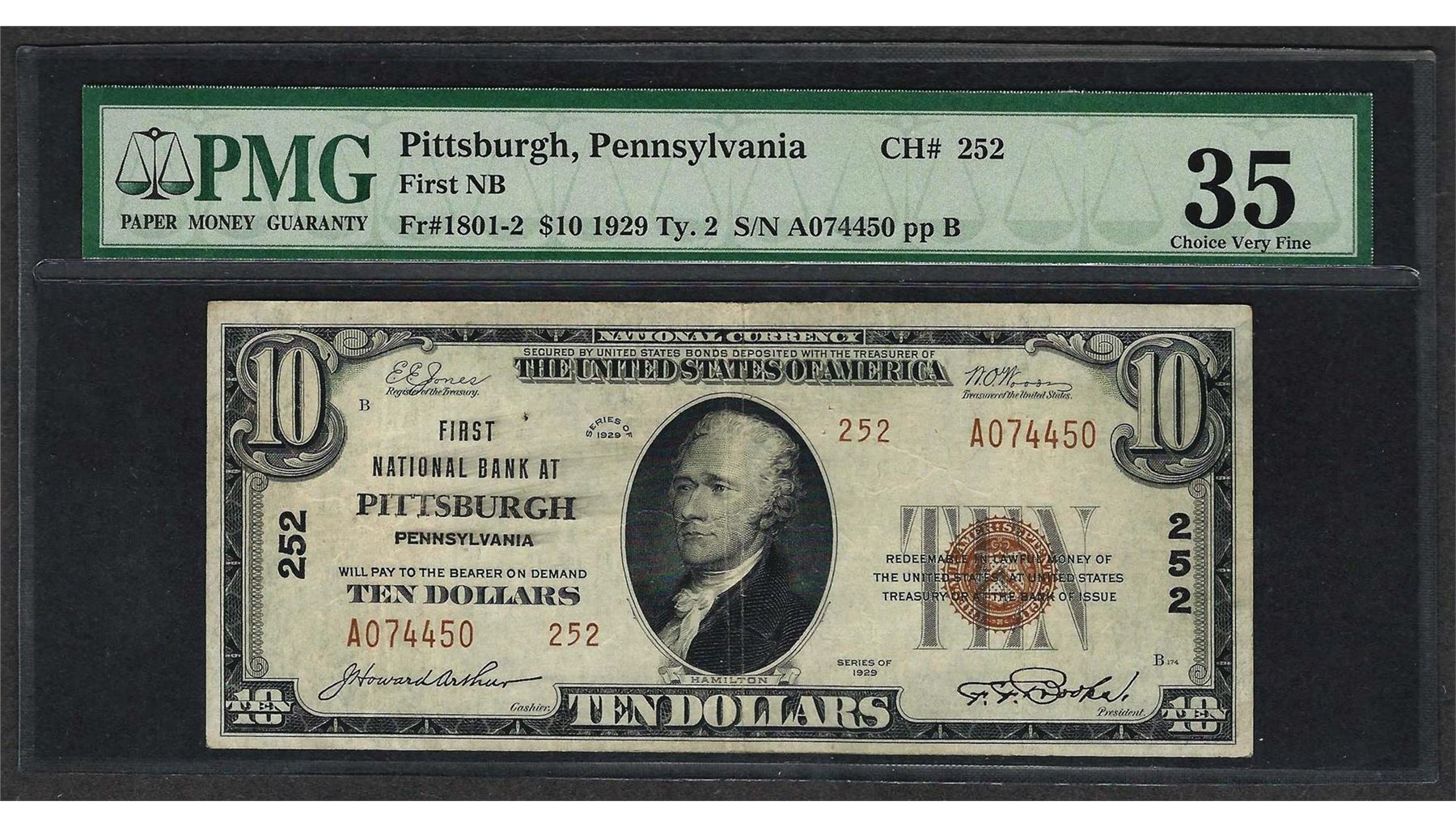 One 1929 $10 National Currency Note Pittsburgh, Pennsylvania CH# 252 PMG Choice Very Fine 35. PMG Certified.
